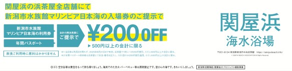 写真に書いてあるように、関屋浜の浜茶屋にマリンピアの入場券を持ってきてくださると500円以上のお買い物で200円オフになります。