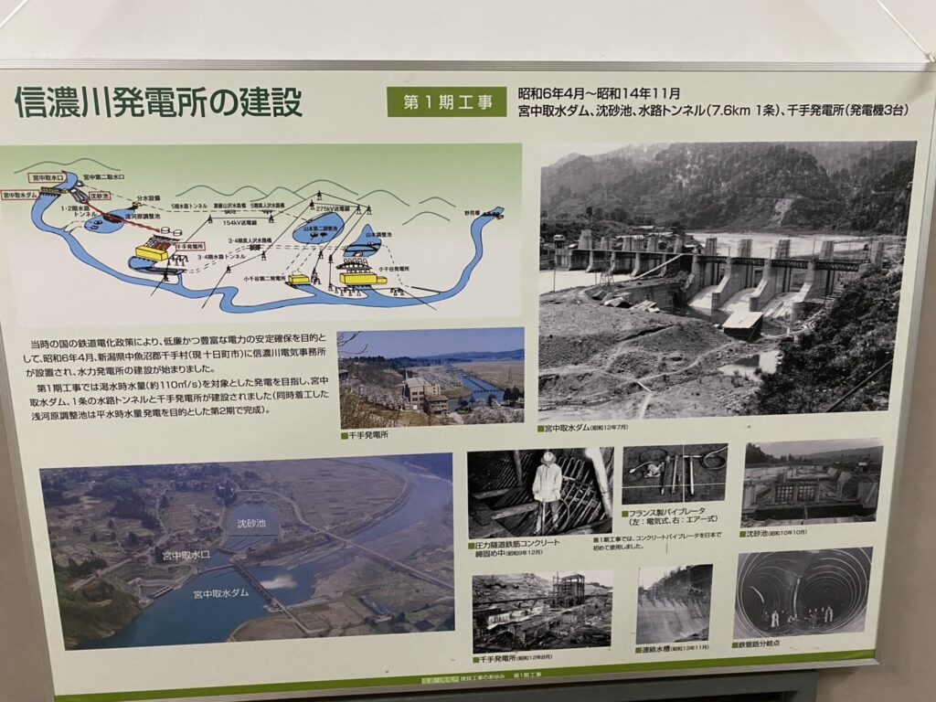 十日町市の宮中取水ダム(たぶん昔の中里村)で信濃川から水をもらって十日町市や小千谷市の地面の下をパイプで水を流し、千手発電所と小千谷発電所で発電すると。水力発電ですね。