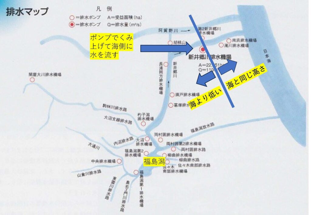 さて、この新郷川排水機場。写真にも貼りましたが、福島潟周辺は海よりも地盤が低いので雨水や山から流れてきた水が海に流れ出てくれません。