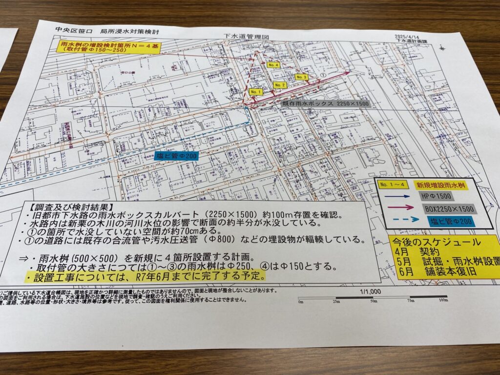 今回工事をする笹口の皆さんから「私たちは声をあげられたからいいけど、声をあげられない、そのやり方がわからない地域もあると思う。LINEとかで浸水状況、道路陥没、その他の情報を吸い上げる手法等はないか」との意見も。